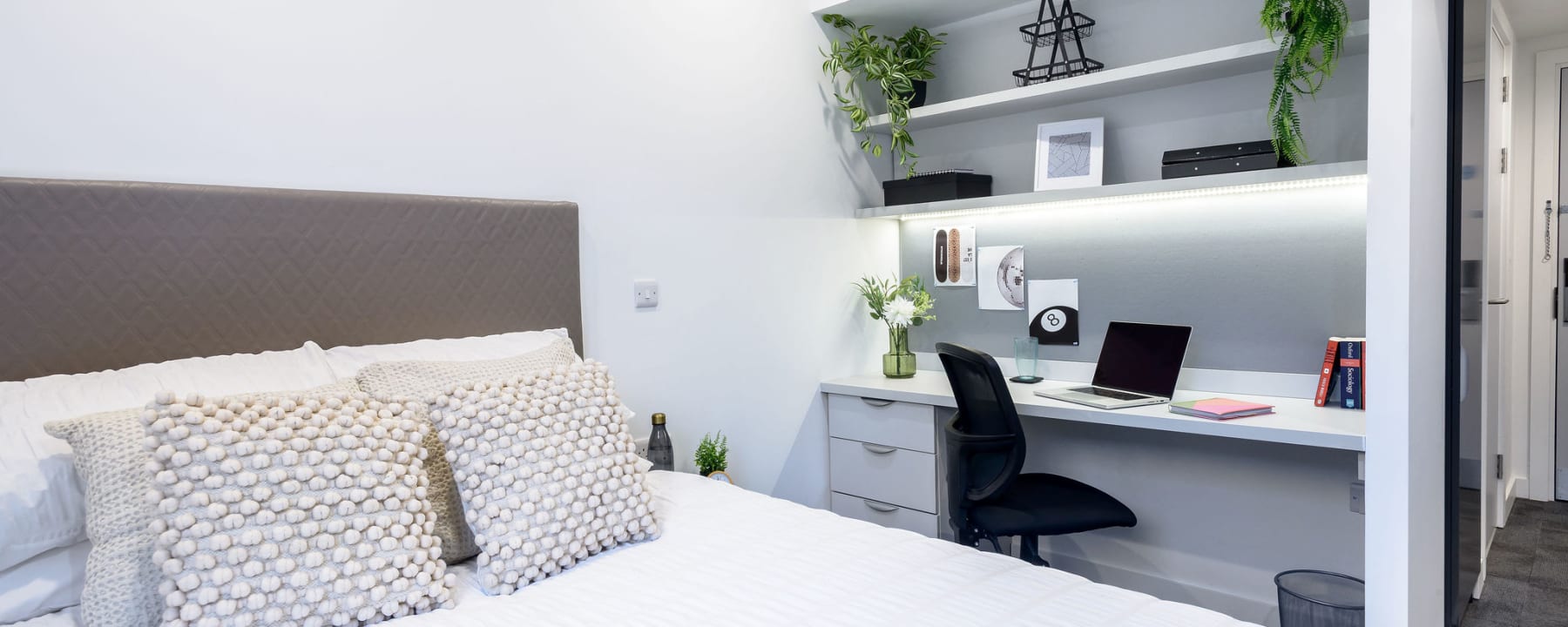 In a Studio, everything is yours - your private en-suite, comfy double bed, study area, and your very own kitchenette, all in one stylish, self-contained space.