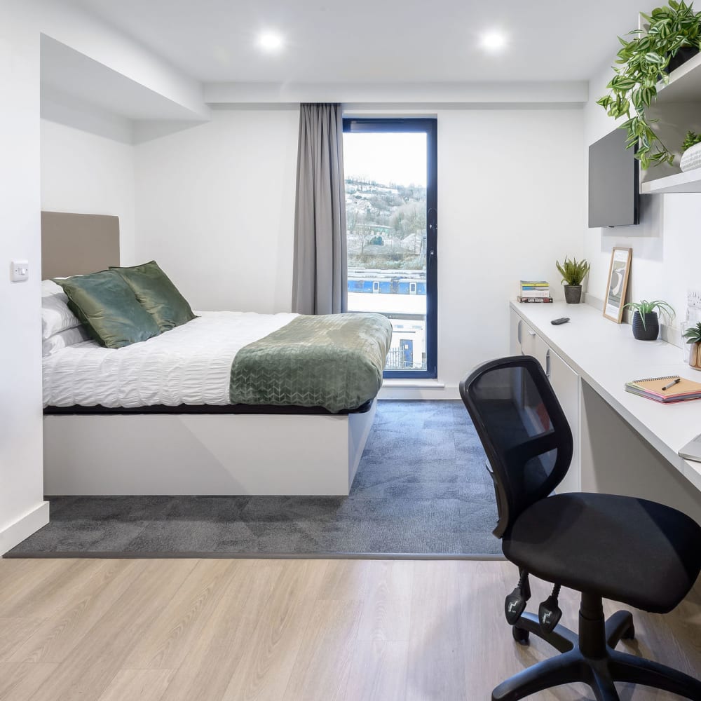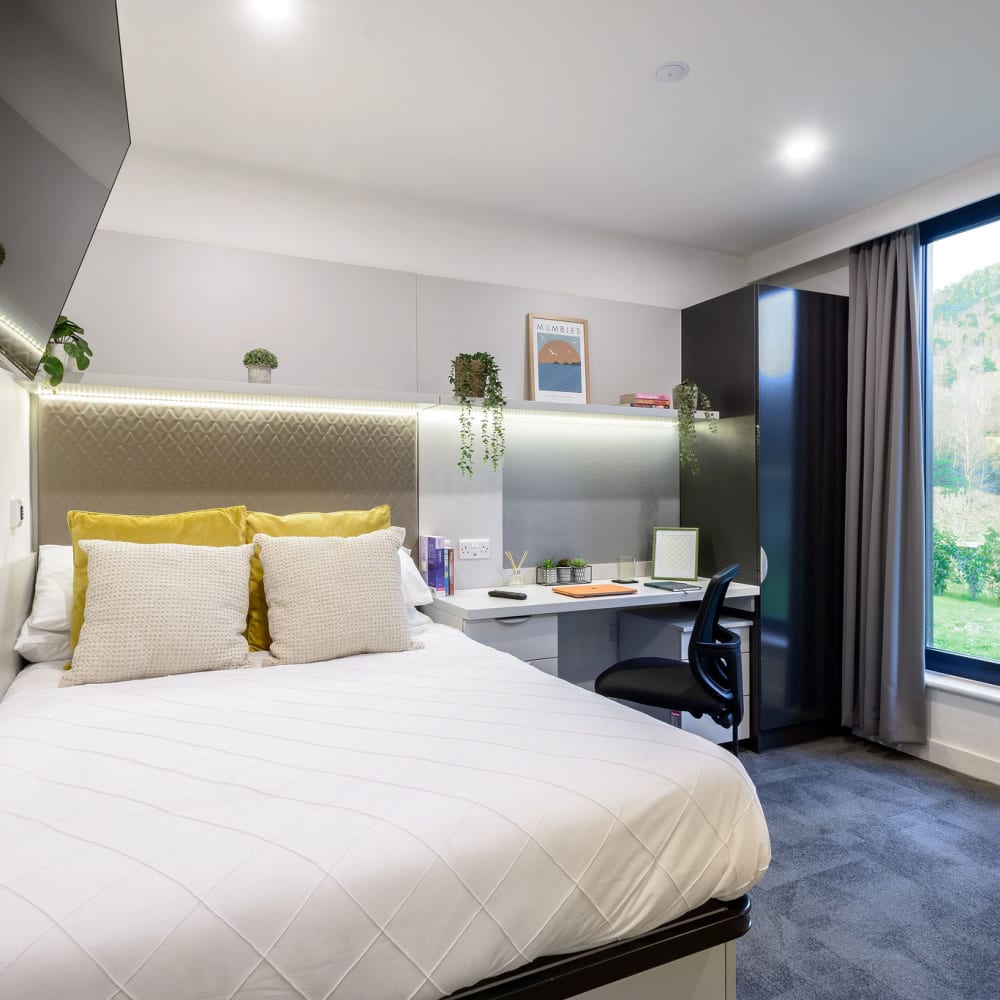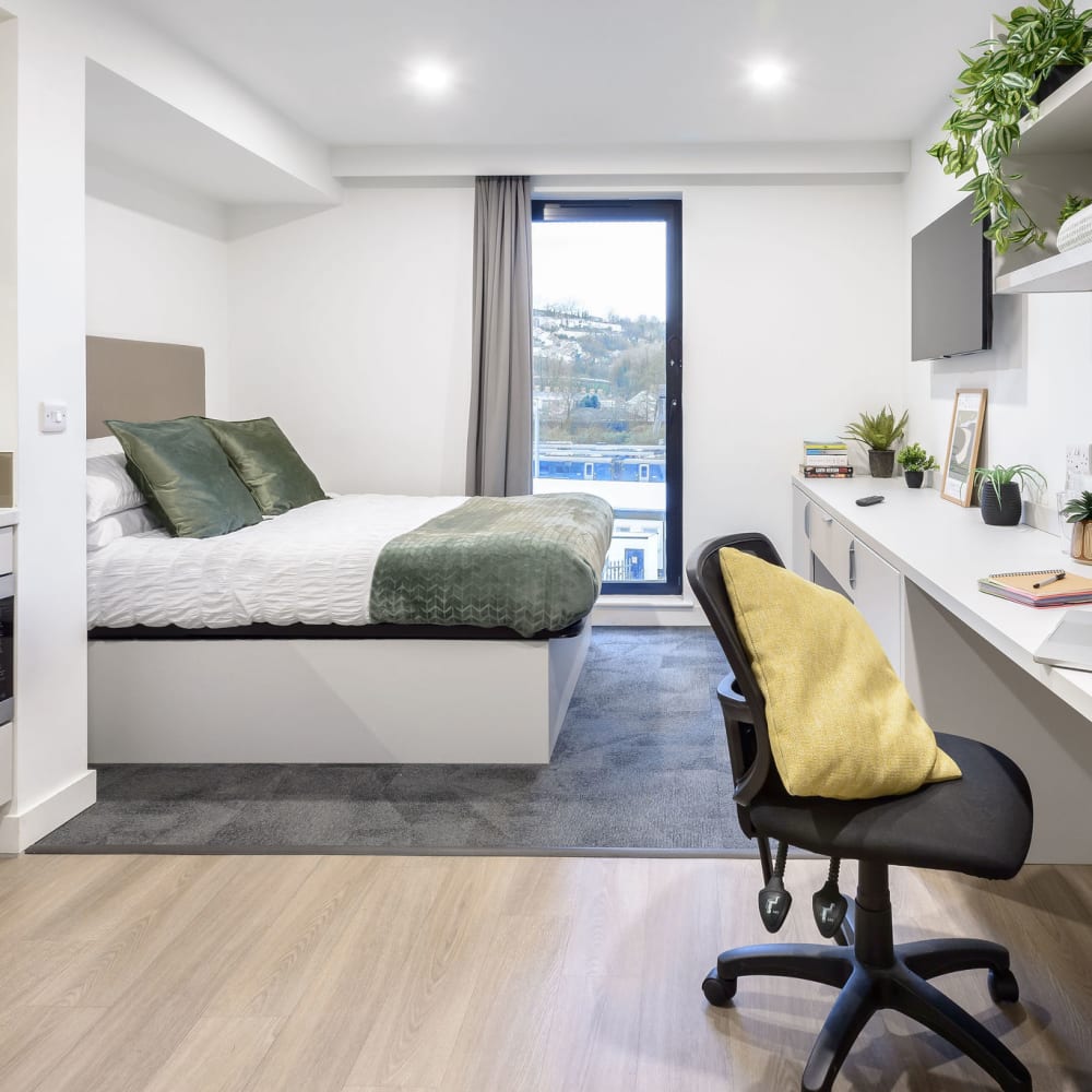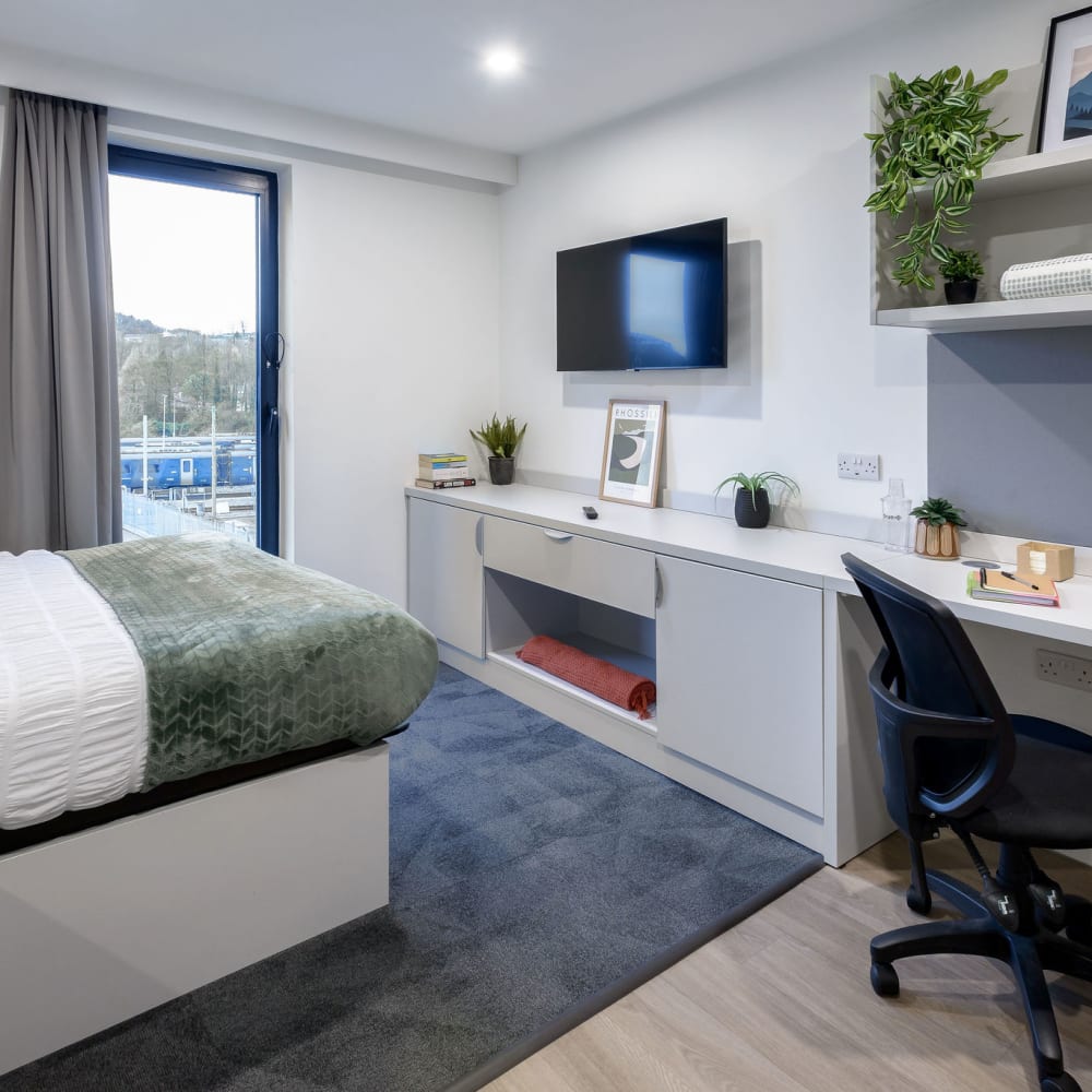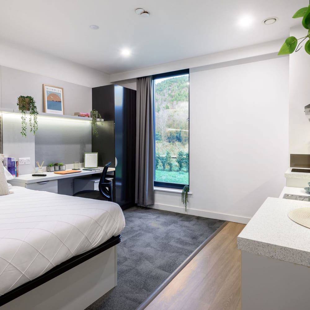 Our 21sqm studio, fit with a double bed, private kitchenette and ensuite bathroom with a view of the River Tawe. This room has been designed for ease of access.